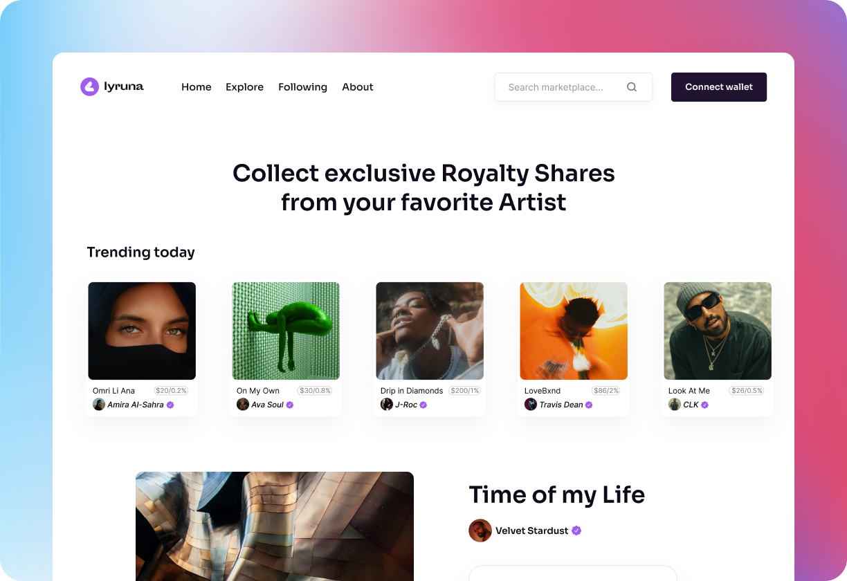 Experience a revolutionary way to support and invest in your favorite artists with the Lyruna Marketplace